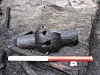 Among the numerous bone fragments, they have only found a few arrowheads, the remains of a shield and a very well preserved axe, complete with a shaft, which is very rare.