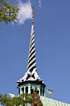 Spiret viser fire dragehaler som snor seg sammen og ender i en spiss der tre kroner symboliserer det som da, for 400 år siden, var kongeriket Danmark, Sverige og Norge.